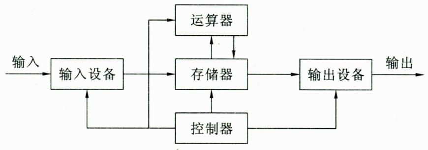 冯·诺伊曼提出计算机硬件设备由存储器、运算器、控制器、输入设备和输出设备五部分组成,由总线连接。总线包括地址总线、数据总线、控制总线
