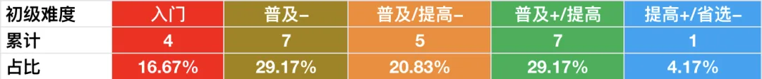 总体来看,难度主要集中在三个级别:普及−占比 29.1%、普及/提高−占比 20.8%、普及+/提高占比 29.1%。