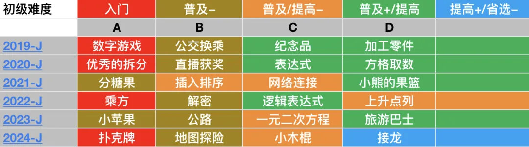 今天打算统计一下 2019 年到 2024 年近 6 年 CSP-J 编程算法的难度、题型,从而总结出常见的题型。